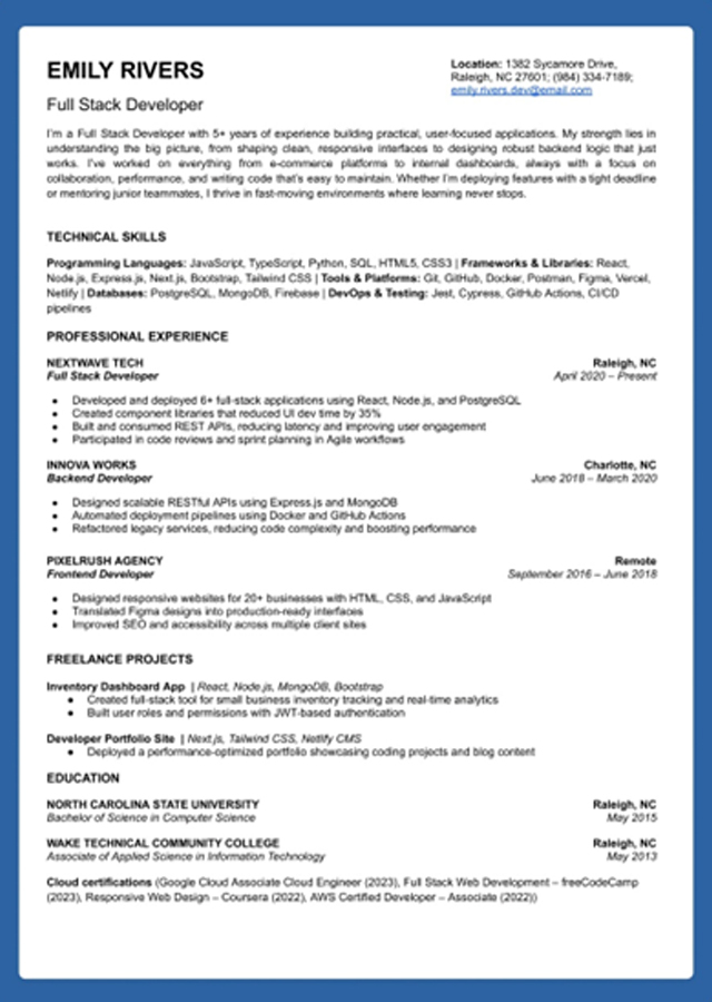 Minimalist layouts work best here. Tech recruiters scan for skills and experience fast—they don't need visual flair. The Full Stack Developer template keeps technical skills sections prominent, usually right after your summary or even before work experience.