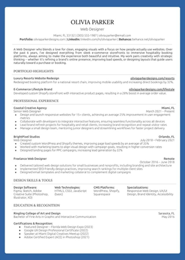 The Web Designer template has more visual flexibility while staying ATS-compatible. It includes portfolio integration sections because your work matters as much as your resume. You need to stand out, but you still need to pass automated screening first.